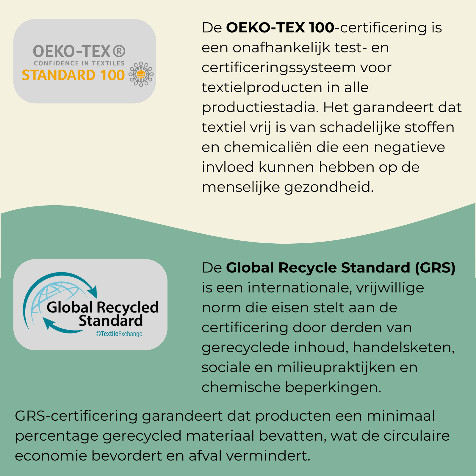 We zijn super serieus over hoe onze producten worden gemaakt, en daarom zijn al onze fabrieken in China OEKO-TEX 100 en Global Recycle Standard (GRS) gecertificeerd. Dat betekent dat ze alle tests voor duurzaamheid EN ethische arbeidspraktijken hebben doorstaan. 💪